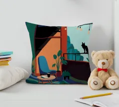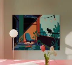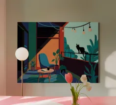 Un elegante gatto nero siede sul davanzale di una finestra di notte, osservando un edificio vicino. Il blu intenso della notte e la calda luce interna creano un'atmosfera misteriosa e accogliente, catturando un tranquillo momento di contemplazione felina.