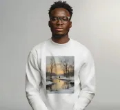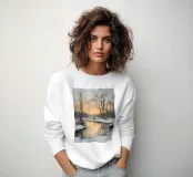 Questo suggestivo motivo artistico mostra un tranquillo paesaggio invernale con alberi innevati, un fiume ghiacciato e un caldo tramonto che evoca riflessi dorati sul ghiaccio. Una singola figura in lontananza esalta la tranquillità e la contemplazione di questa scena. Perfetto per chi ama i quadri romantici invernali, l'arte del paesaggio, i motivi naturalistici e le decorazioni murali d'atmosfera. Ideale come stampa d'arte invernale, quadro natalizio, murale naturalistico, poster paesaggistico, decorazione accogliente per il soggiorno, arte paesaggistica invernale, idea regalo, arte romantica invernale e illustrazione naturalistica.