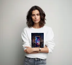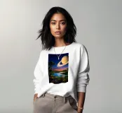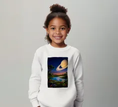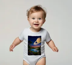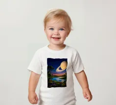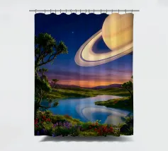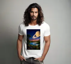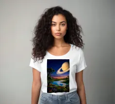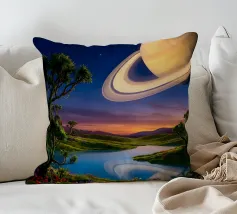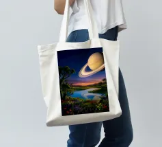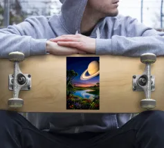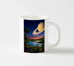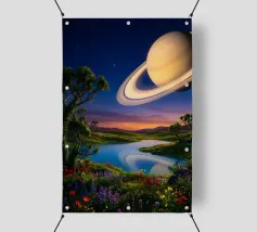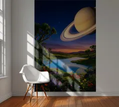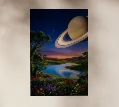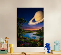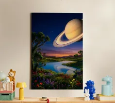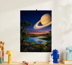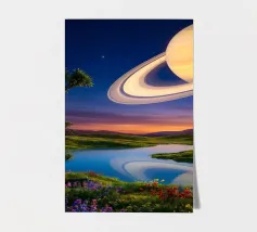 Immergete il vostro spazio nella meraviglia cosmica con questa incantevole opera d'arte che raffigura un lago sereno circondato da vivaci fiori selvatici e colline verdi sotto un cielo luminoso al tramonto. Un Saturno gigante mozzafiato si erge sopra l'orizzonte, con i suoi iconici anelli che si riflettono magnificamente nella calma acqua blu. Questo surreale paesaggio di fantasia fonde la maestosità celeste con il fascino terrestre, creando una scena pacifica e al tempo stesso suggestiva. Perfetto per gli amanti dell'arte spaziale, dei mondi onirici e dell'arredamento fantasioso.