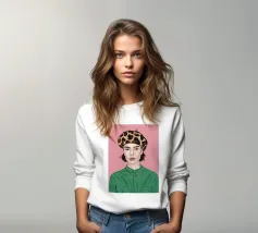 Questo dipinto raffigura il profilo laterale di una persona con fluenti capelli rosa ornati da una vivace ed elaborata corona floreale. Lo sfondo è di un beige tenue che mette in risalto i fiori colorati e l'espressione serena della persona.