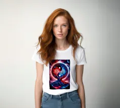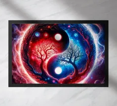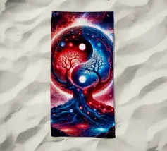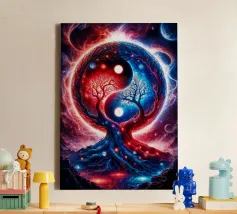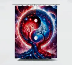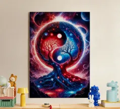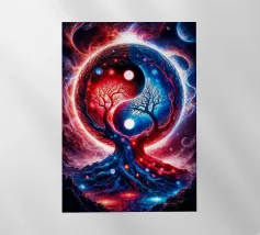 Una vibrante opera d'arte digitale raffigura un grande albero con rami intrecciati che formano un simbolo yin yang. L'albero è circondato da una nebulosa vorticosa di tonalità rosse e blu, con piccoli pianeti e stelle sparsi. Il simbolo yin yang è diviso in due metà, una rossa e una blu, ognuna delle quali rappresenta un diverso aspetto dell'universo.