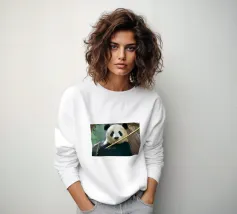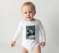 Un simpatico panda si sta godendo un bagno, circondato da schizzi e bolle. La scena si svolge in un bagno con piastrelle color verde acqua e una barra da bagno in legno.