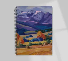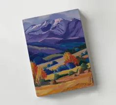 Un ampio paesaggio autunnale che ritrae dolci colline dalle vibranti tonalità di arancio, giallo e viola, punteggiate da alberi sparsi, che conducono verso maestose montagne innevate sotto un cielo limpido.