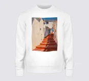 Uno stretto passaggio illuminato dal sole tra edifici bianchi è caratterizzato da una serie di scale rosso cremisi che creano una composizione audace, grafica e architettonicamente interessante, ricca di fascino mediterraneo.