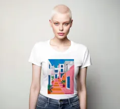 Una vivace illustrazione di una strada a gradini fiancheggiata da edifici colorati nei toni del rosa e del blu, caratteristici di una città mediterranea. La scena è luminosa, allegra e piena di fascino estivo.