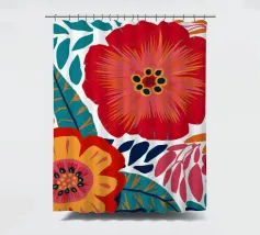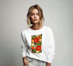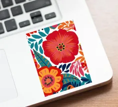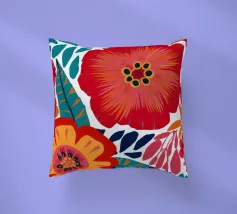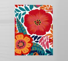 Un potente primo piano di un grande papavero rosso stilizzato circondato da altri fiori e foglie colorate. I colori intensi e la composizione audace evocano un senso di passione e di vita vibrante.