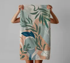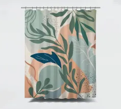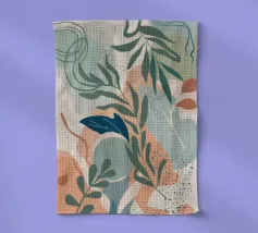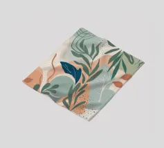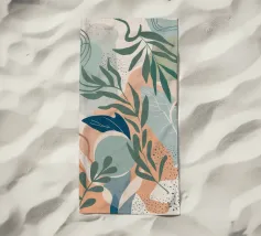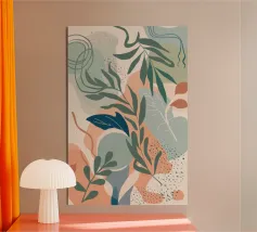 Una composizione astratta elegante e serena presenta foglie sovrapposte e forme organiche in una tavolozza morbida e pastello, creando un'opera d'arte botanica calma e delicata.