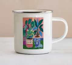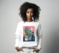 Una collezione di rigogliose piante d'appartamento in vaso con un gatto comodamente adagiato nelle vicinanze, su uno sfondo rosa, che crea una giungla domestica serena ed elegante.