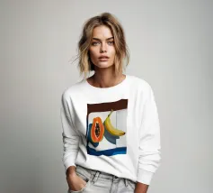Un'illustrazione audace e ispirata alla pop art di banane e papaya su un piatto rosso brillante. I colori ad alto contrasto e lo stile grafico creano una dichiarazione vibrante e giocosa.