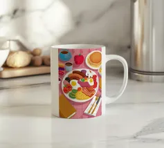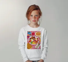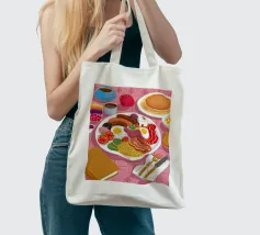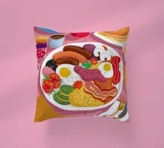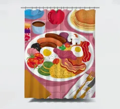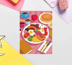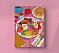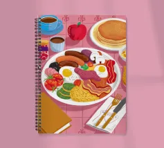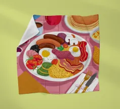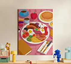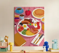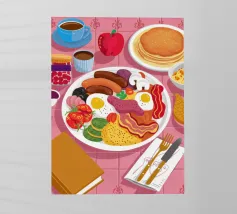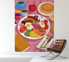 Una deliziosa illustrazione dall'alto di una colazione completa all'inglese, con pancake, uova, salsicce, pancetta, fagioli e caffè, una vera festa per iniziare la giornata.
