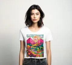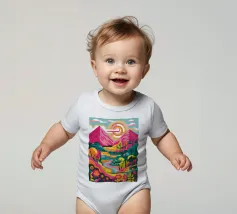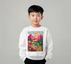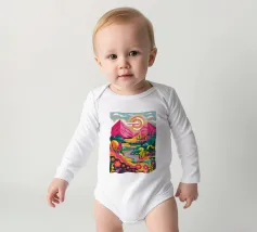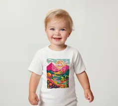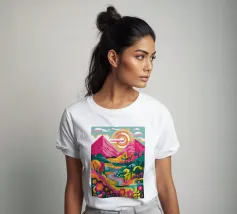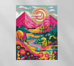 Un paesaggio vibrante e fantasioso, con una montagna sotto un sole radioso e un fiume arcobaleno colorato che la attraversa. Il design stilizzato e giocoso è pieno di gioia ed energia creativa.