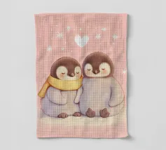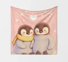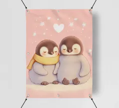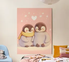 Due pinguini innamorati con una sciarpa su uno sfondo rosa tenue, mentre un cuore simboleggia la loro dolce tenerezza. Questa illustrazione minimalista porta gioia e romanticismo in ogni spazio abitativo!