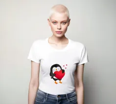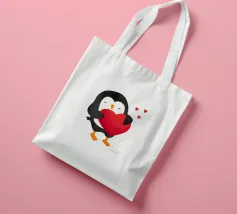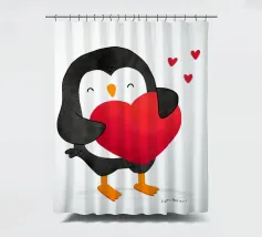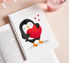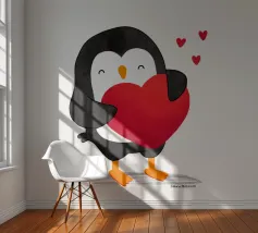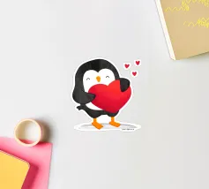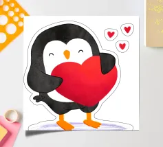 Simpatico disegno di un pinguino felice che abbraccia un grande cuore rosso e alcuni cuoricini che lo circondano