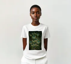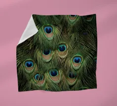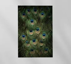 Ciascuna piuma termina con un sorprendente motivo a "occhio": un audace ovale di turchese brillante circondato da anelli di blu ricco e nero vellutato. Le sottili barbe lungo l'asta catturano la luce, creando una lucentezza abbagliante, quasi metallica. Quando sono aperte, le piume formano un magnifico ventaglio che mostra la bellezza e la grazia del pavone in un dettaglio mozzafiato.