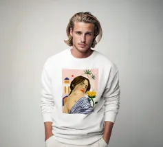 Questo dipinto mostra una persona che indossa una camicia gialla a pois neri e un berretto rosso. Lo sfondo è un motivo astratto colorato con sfumature di blu, giallo e arancione, che conferisce all'opera un'atmosfera giocosa e vivace.