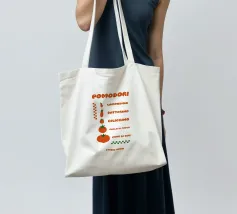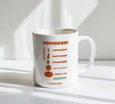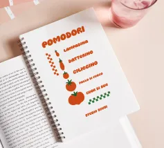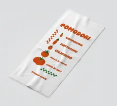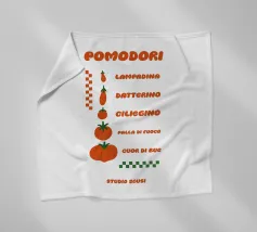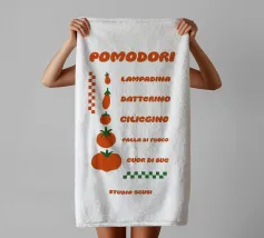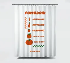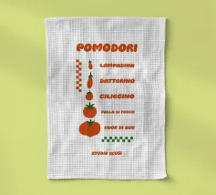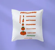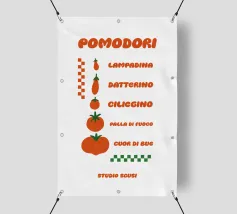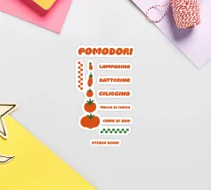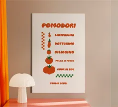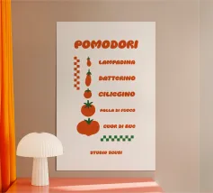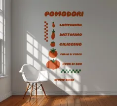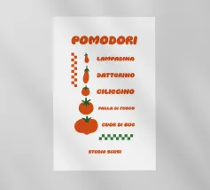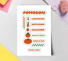 Un poster grafico che celebra la diversità dei pomodori italiani, dal delicato Datterino al potente Cuor di Bue. Le varietà sono disposte verticalmente, ognuna con il proprio carattere e nome in arancione brillante. Il titolo "POMODORI" troneggia in alto, incorniciato da motivi a scacchiera rossi e verdi che emanano un'atmosfera mediterranea.