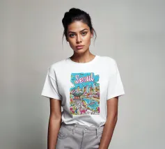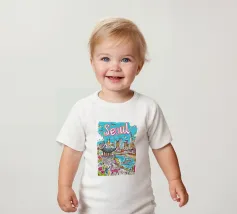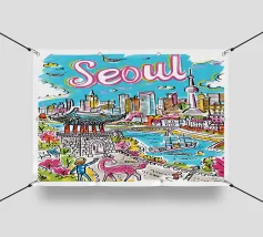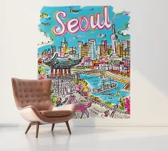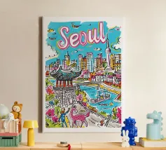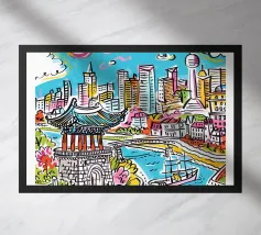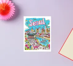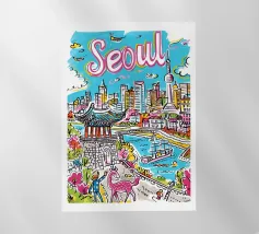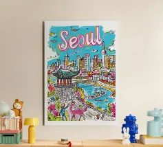 Questo poster vibrante e giocoso in stile cartone animato cattura l'energia dinamica di Seoul, Corea del Sud. L'opera d'arte presenta una stravagante miscela di punti di riferimento tradizionali e moderni, tra cui una porta storica, un fiume con un ponte e uno sfondo di grattacieli moderni e la torre di Seoul. L'illustrazione è ricca di linee decise e di una tavolozza di colori vivaci e allegri, che le conferiscono un'atmosfera divertente ed energica. L'affascinante testo "Seoul" scritto a mano e i ghirigori giocosi aggiungono un'estetica artistica e creativa. Questo poster digitale di alta qualità (7000x5000 pixel, 300 dpi) è un'opera d'arte di prima qualità che le celeb