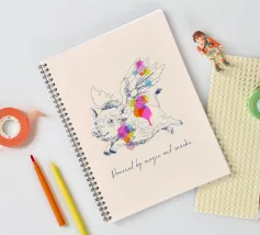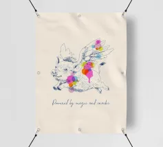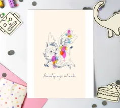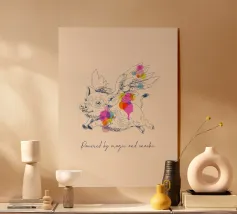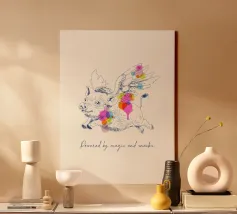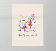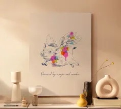 Questa deliziosa illustrazione presenta un maiale volante disegnato a mano e ornato da giocosi schizzi di colori vivaci, che emanano fascino e stravaganza. Con la frase "Powered by magic and snacks", questa opera d'arte cattura perfettamente uno spirito spensierato e umoristico. Ideale per l'arredamento di una cameretta, per l'arte della cucina o per regali edificanti per sognatori e amanti degli snack, è un divertente oggetto di conversazione che porta gioia e immaginazione in ogni spazio.