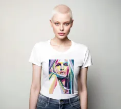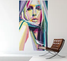 Un'illustrazione WPAP (Wedha's Pop Art Portrait) vibrante e geometrica della Principessa del Pop, caratterizzata da forme audaci e intersecanti in una tavolozza di colori vivaci. I tratti del viso sono stilizzati con angoli acuti e tinte contrastanti, creando una composizione dinamica ed energica. L'opera cattura il suo look iconico con occhi espressivi e capelli fluenti, resi in modo astratto ma riconoscibile. L'uso di colori vivaci e non realistici esalta l'estetica moderna e pop-art, rendendo il ritratto visivamente sorprendente e pieno di vita.