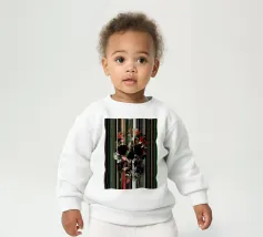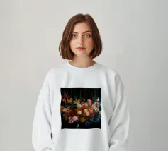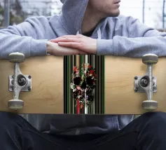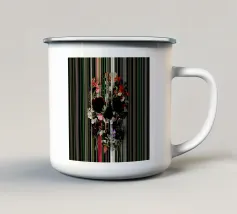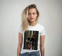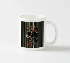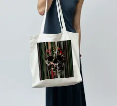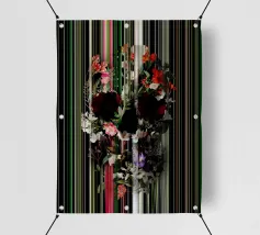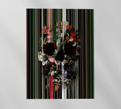 Un bouquet delicato con un tocco dark. Questa opera d'arte rivela un teschio formato interamente da fiori e fogliame lussureggianti, che galleggia su uno sfondo nero profondo. Bande verticali di colore verde neon, rosa arrossato, crema e bianco attraversano l'opera come glitch digitali, squarciando i fiori e conferendo al disegno un'atmosfera moderna, quasi olografica.