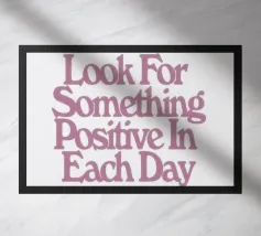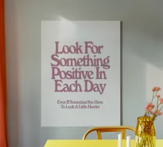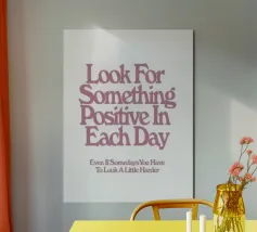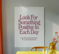 Questo poster ispirazionale con il messaggio "Look For Something Positive In Each Day - Even If Somedays You Have To Look A Little Harder" (Cerca qualcosa di positivo in ogni giorno - anche se qualche volta devi cercare un po' di più) ci ricorda di vedere il lato positivo anche nei giorni più difficili. Il design minimalista con tenui colori vintage lo rende un'elegante decorazione da parete per la casa, l'ufficio o come regalo per una persona cara.