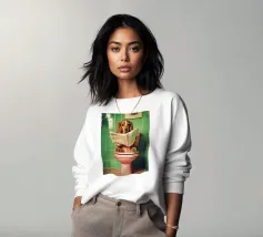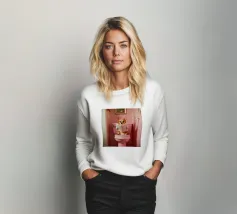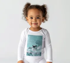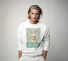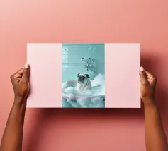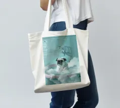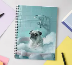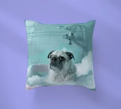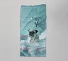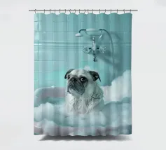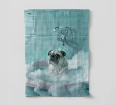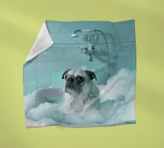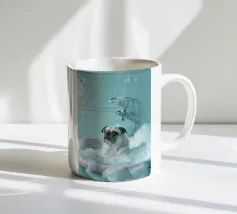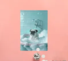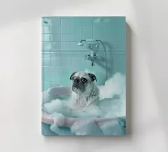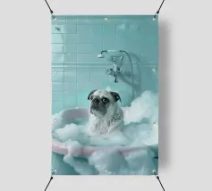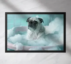 Un carlino siede in una vasca da bagno piena di bolle, circondato da piastrelle blu chiaro e da un rubinetto argentato. L'espressione del cane è allo stesso tempo carina e un po' triste mentre si fa il bagno.