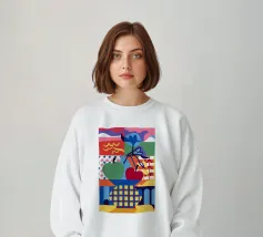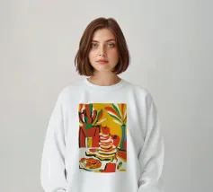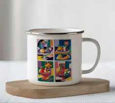 Una composizione divisa in quattro quadranti colorati, ognuno dei quali raffigura una diversa composizione di natura morta di frutta, vasi e brocche. Lo stile vibrante e colorato ricorda la pop art moderna o il fauvismo.
