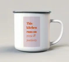 Lo slogan "This kitchen runs on pizza & positivity" (Questa cucina funziona con la pizza e la positività) è inserito in un'elegante combinazione di caratteri serif in grassetto e corsivi giocosi. La scelta del colore - un caldo e appetitoso arancione terracotta su un morbido sfondo lilla - trasmette intimità e un aspetto moderno e invitante.