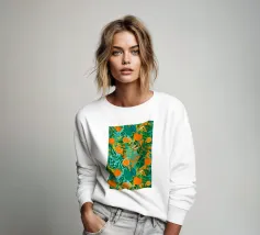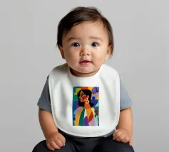 Un ritratto sorprendente di una donna con i capelli scuri, ornata da un orecchino giallo, raffigurata in uno stile vibrante, con blocchi di colore che utilizzano forme audaci di verde, arancione, blu e giallo, che trasudano sicurezza ed eleganza moderna.