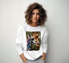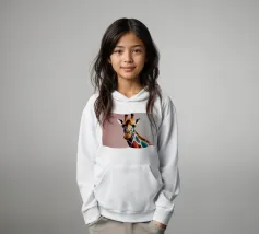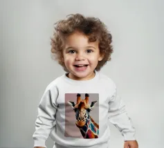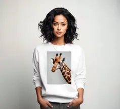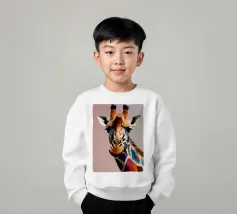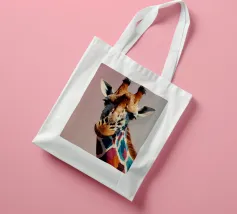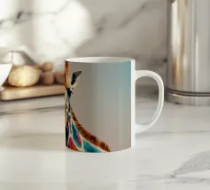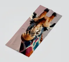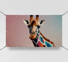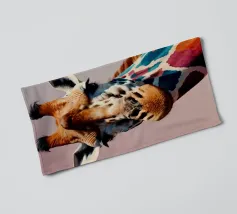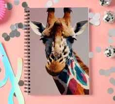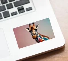 Una giraffa si staglia in primo piano, ornata da motivi vivaci e colorati. Lo sfondo è una sfumatura liscia, che esalta l'aspetto unico della giraffa in un ambiente vivace.