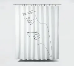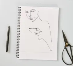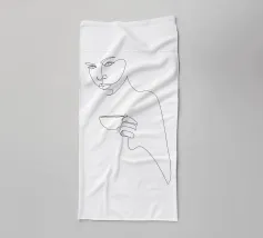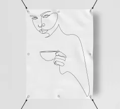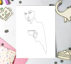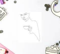 Disegno al tratto astratto e minimale di giovane donna con una tazza di bevanda calda