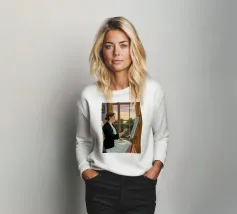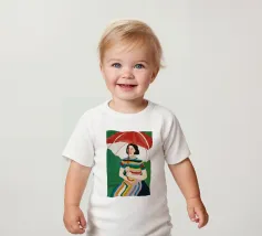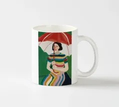 Illustrazione di una donna che tiene un ombrello rosso e indossa un abito colorato a righe arcobaleno. La composizione è una rappresentazione chic, elegante e leggermente malinconica della ricerca del colore in una giornata grigia.
