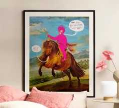 Utilizzo materiali di uso quotidiano per riassemblarli sotto diverse angolazioni. Mi piace anche lavorare con la sovrapittura di stampe d'arte (principalmente opere della storia dell'arte occidentale, ma anche immagini di riviste e cartoline). Sovradipingendo la stampa d'arte, la visione dell'immagine cambia e l'immagine cambia il suo messaggio. Sono soprattutto le immagini che servono allo sguardo maschile a essere sovrapitturate dall'artista. Così, le donne per lo più nude e indifese delle stampe si trasformano in guerrieri e supereroi. Le maschere e gli attributi che conferisco loro oscillano tra Catwoman e Pussy Riot.