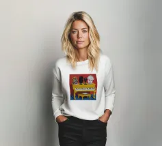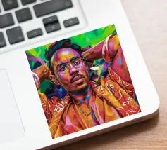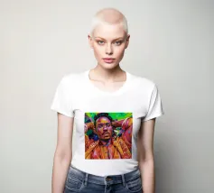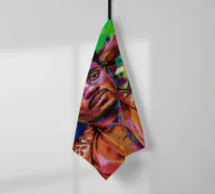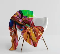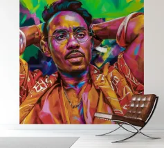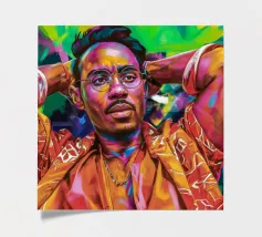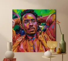 Questa opera d'arte raffigura una persona sdraiata con le braccia dietro la testa, circondata da forme e motivi astratti colorati. I colori vivaci e la posa rilassata trasmettono un senso di svago e comfort.