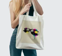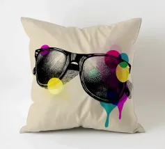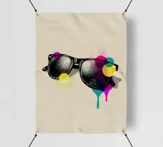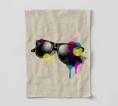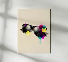 Un disegno in stile vintage di occhiali da sole arricchito da macchie di colore vivaci e gocciolanti. Un pezzo audace e stravagante per gli amanti della moda retrò e dell'arte pop.