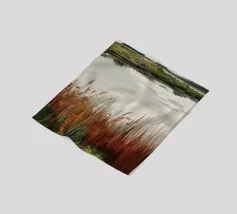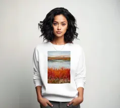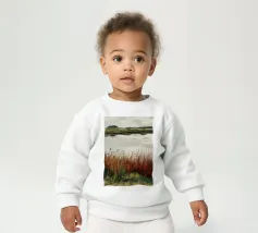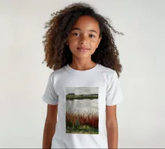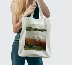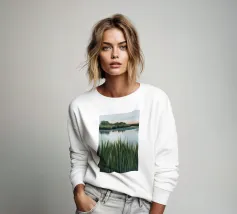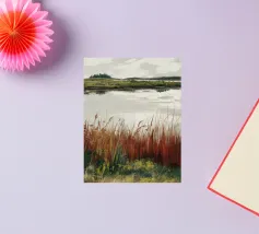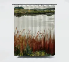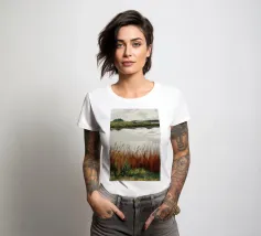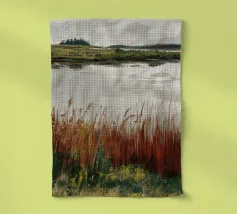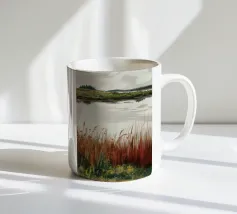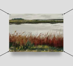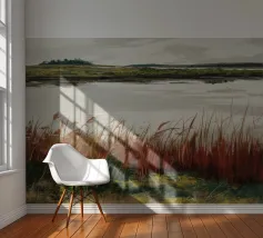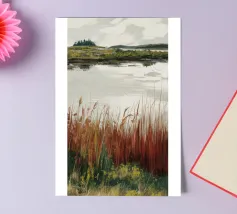 Una tranquilla scena di palude si svolge sotto un cielo calmo e nuvoloso. Canne alte ed erbe dorate si ammassano sull'acqua ferma, con i loro toni marroni e ocra che si riflettono dolcemente sulla superficie. In lontananza, campi verdi e basse colline si fondono in un orizzonte nebbioso. L'atmosfera è quella di una pacifica solitudine e di un silenzio naturale, che cattura la dolce bellezza di un tranquillo paesaggio palustre.