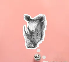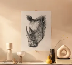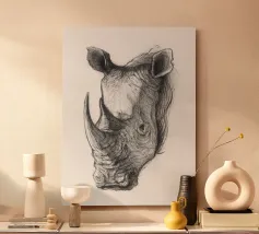 Un rinoceronte duro e maestoso si erge fiero, incarnando forza e resilienza. Con la sua potente presenza e il suo fascino robusto, questo disegno cattura la cruda bellezza della natura selvaggia.