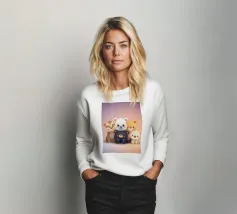 Una mano regge una Polaroid di orsi e cani di peluche su uno sfondo verdeggiante con soffici nuvole. L'immagine nostalgica evoca gioia e momenti preziosi congelati nel tempo.