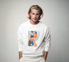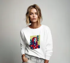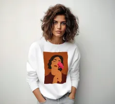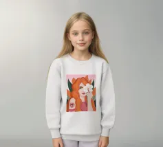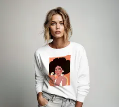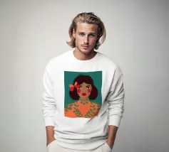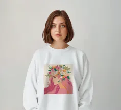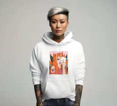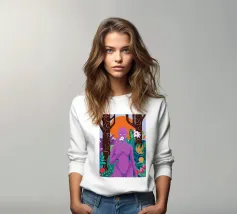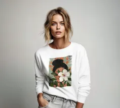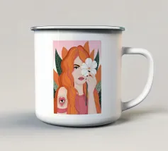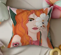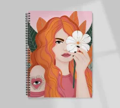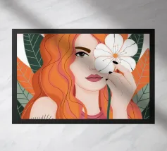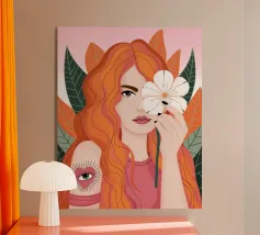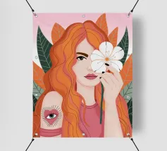 Una persona con lunghi capelli rossi è raffigurata con un occhio tatuato sul braccio, circondato da grandi foglie e fiori, che suggeriscono un senso di mistero e introspezione.