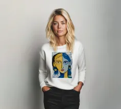 Questo dipinto presenta una figura dai capelli dorati e dalla pelle blu. La natura astratta dell'opera crea un senso di riflessione e introspezione.