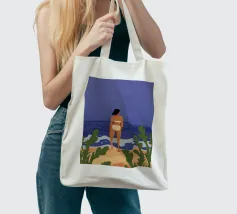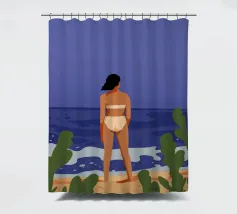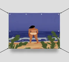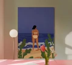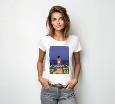 Una donna in bikini bianco si trova sul bordo della spiaggia e guarda il mare al crepuscolo, circondata da una vegetazione lussureggiante.