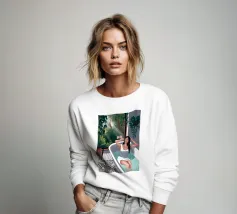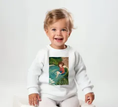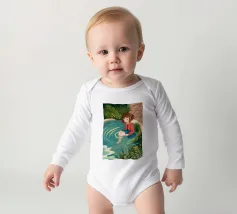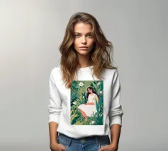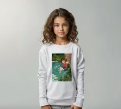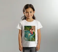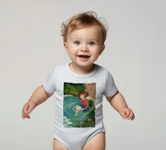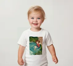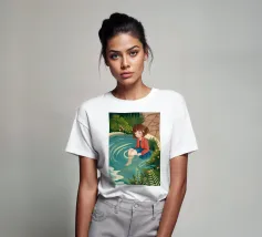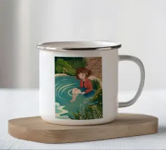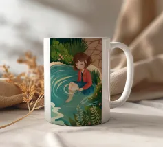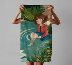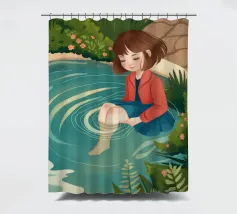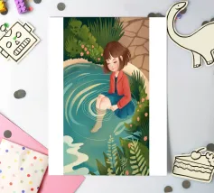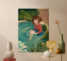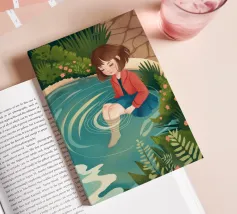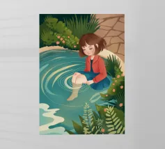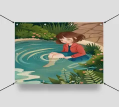 Una persona è seduta vicino a uno stagno, immergendo i piedi nell'acqua mentre legge un libro. Il verde circostante e l'acqua calma creano un ambiente tranquillo.