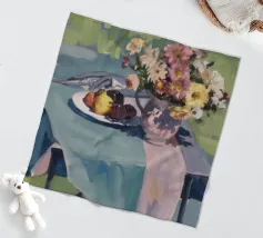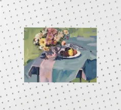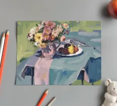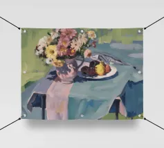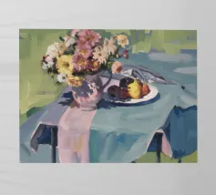 Un'affascinante natura morta con una ciotola di fiori vivaci e dai toni terrosi, probabilmente dalie o zinnie, accanto a un piatto con prugne scure e un delicato pasticcino, il tutto disposto su un tavolo grigio-blu tenue, che suggerisce un rustico dolcetto mattutino.