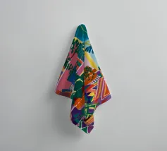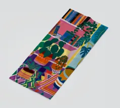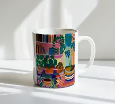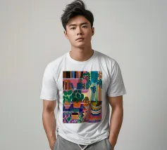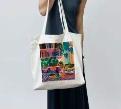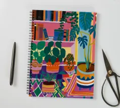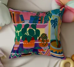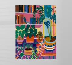 Una scena di interni con una persona che si occupa di una collezione di piante in vaso su scaffali e tavoli, caratterizzata da un'estetica calda, bohémien e colorata.
