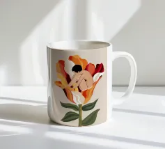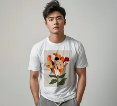 Una figura è raffigurata mentre emerge o si culla all'interno di un grande fiore stilizzato di giglio giallo e arancione. L'immagine suggerisce temi di rinascita, crescita e connessione con la natura in modo surreale e artistico.
