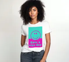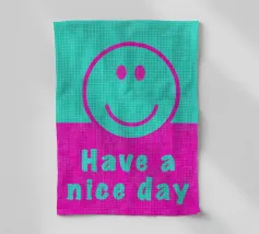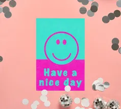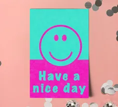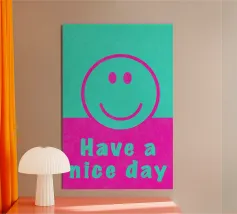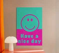 Portate gioia e vibrazioni positive nella vostra casa con questa stampa artistica colorata! L'allegra combinazione di blu e rosa, insieme al volto sorridente e al messaggio "Have a nice day", farà sorridere chiunque. Quest'opera d'arte è perfetta per aggiungere un'atmosfera fresca e ottimista a qualsiasi stanza. Che sia in salotto, in ufficio o in camera da letto, è un vero e proprio richiamo visivo che diffonde il buon umore!
