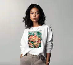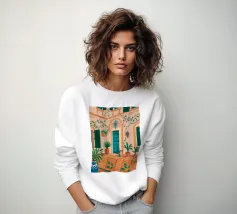 Un cortile con una struttura a cupola blu è ornato da tende fluenti e da una vegetazione lussureggiante. L'atmosfera invitante fonde l'eleganza architettonica con la tranquillità naturale.