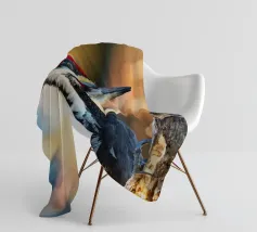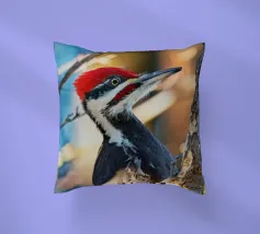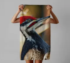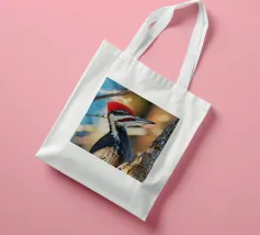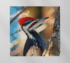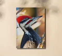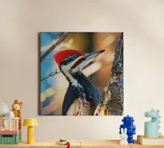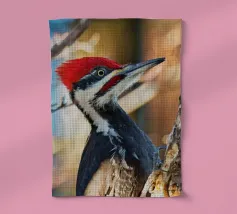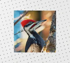 Il picchio è appollaiato su un tronco d'albero, con il corpo slanciato e un misto di piume rosso vivo sulla testa, nere sul dorso e striature bianche evidenti sulle ali. Le sue forti zampe si aggrappano saldamente al tronco verticale dell'albero. I suoi occhi acuti sono diretti verso l'obiettivo, emanando un senso di intelligenza, pronti a battere ritmicamente sul tronco dell'albero in cerca di prede. Lo spazio circostante emana la selvaticità della foresta, evidenziando l'aspetto operoso e forte di questa speciale specie di uccello.