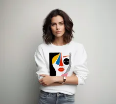 Un ritratto astratto di un volto costruito da forme frammentate e sovrapposte di colore rosa, rosso, blu e arancione che creano un'immagine potente, emotiva e moderna.