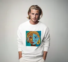 Quest'opera d'arte raffigura un ritratto astratto a due colori con sfumature blu e gialle. Le pennellate sono espressive e dinamiche e aggiungono profondità all'opera.